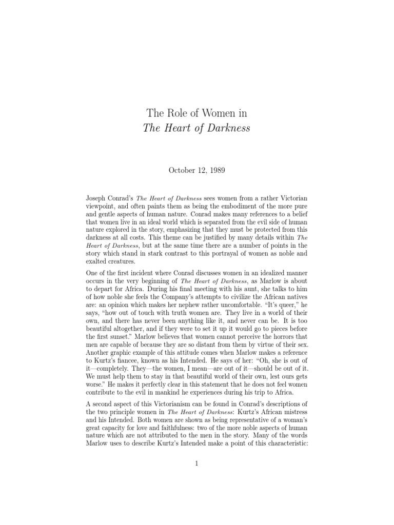 Heart of Darkness Essay Words | 4 Pages. Heart of Darkness Darkness permeates every circumstance, scene, and character in Joseph Conrad's novella, Heart of Darkness. Darkness symbolizes the moral confusion that Charlie Marlow encounters, as well as the moral reconciliation he has within himself while searching for Kurtz Heart of Darkness Essay. Exclusively available on IvyPanda. Available only on IvyPanda. Updated: Jul 2nd, The author of the novella, Joseph Conrad, based the story on a trip that he took through Congo during his years as a sailor. The story revolves around the life of a seaman, Marlow, who fresh from Europe goes on a journey up the Congo River to relieve Essay on Feminist Theory in Heart of Darkness Words | 5 Pages Monsters in Heart of Darkness Joseph Conrad’s varying depiction of women in his novel Heart of Darkness provides feminist literary theory with ample opportunity to explore the overlying societal dictation of women’s gender roles and expectations in the late nineteenth and early twentieth century