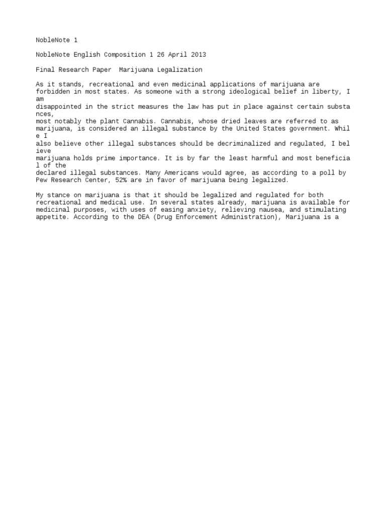 Although it is tempting to use evaluations of decriminalization and medical marijuana policies to shed light on the likely consequences of legalization, the experiences of these states may not fully reflect the changes in price, potency, and product variety that will likely result from increased commercialization and promotion under legalization Caulkins et al. Although research paper on marijuana existing literature may be limited in answering how legalization will affect marijuana use and associated outcomes, it offers significant insights into how we should evaluate the effects of marijuana policy changes in a rapidly evolving and multilayered policy environment.